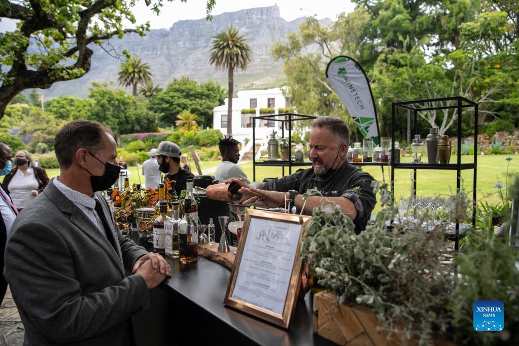 A bartender serves drink during the awarding ceremony of a brandy competition, namely Brandy Innovation Challenge, in Cape Town, South Africa, on Dec. 6, 2021. The top agricultural official of South Africa's Western Cape Province, the main producing area of South African brandy, said the province is looking forward to new markets in China for its "world-class" brandy. (Xinhua/Lyu Tianran)