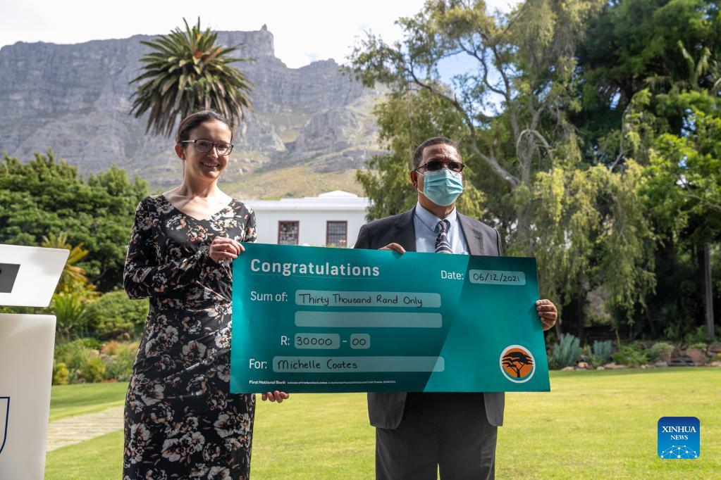 Minister of Agriculture of South Africa's Western Cape Province Ivan Meyer (R) presents an award to a winner during the awarding ceremony of a brandy competition, namely Brandy Innovation Challenge, in Cape Town, South Africa, on Dec. 6, 2021. The top agricultural official of South Africa's Western Cape Province, the main producing area of South African brandy, said the province is looking forward to new markets in China for its "world-class" brandy. (Xinhua/Lyu Tianran)