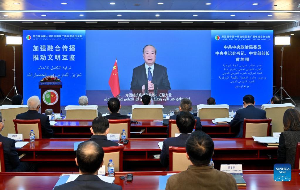 Huang Kunming, a member of the Political Bureau of the CPC Central Committee and head of the Publicity Department of the CPC Central Committee, made the remarks via video at the fifth China-Arab States Broadcasting and Television Cooperation Forum held online and offline in Beijing.