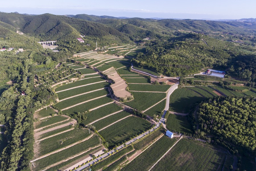 Aerial photo taken on July 1, 2021 shows a view of terraced fields in Dazhai Village of Jinzhong City, north China's Shanxi Province. (Xinhua/Yang Chenguang)