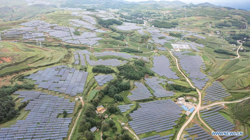 Aerial photo taken on Aug. 24, 2021 shows a photovoltaic power station in Weining Yi, Hui and Miao Autonomous County, Bijie, southwest China's Guizhou Province.  (Xinhua/Tao Liang)