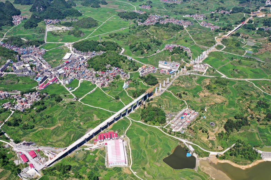 Aerial photo taken on May 22, 2020 shows the Guiyang-Nanning high-speed railway under construction in Xia'nan Town of Huanjiang Maonan Autonomous County, south China's Guangxi Zhuang Autonomous Region. (Xinhua/Lu Boan)