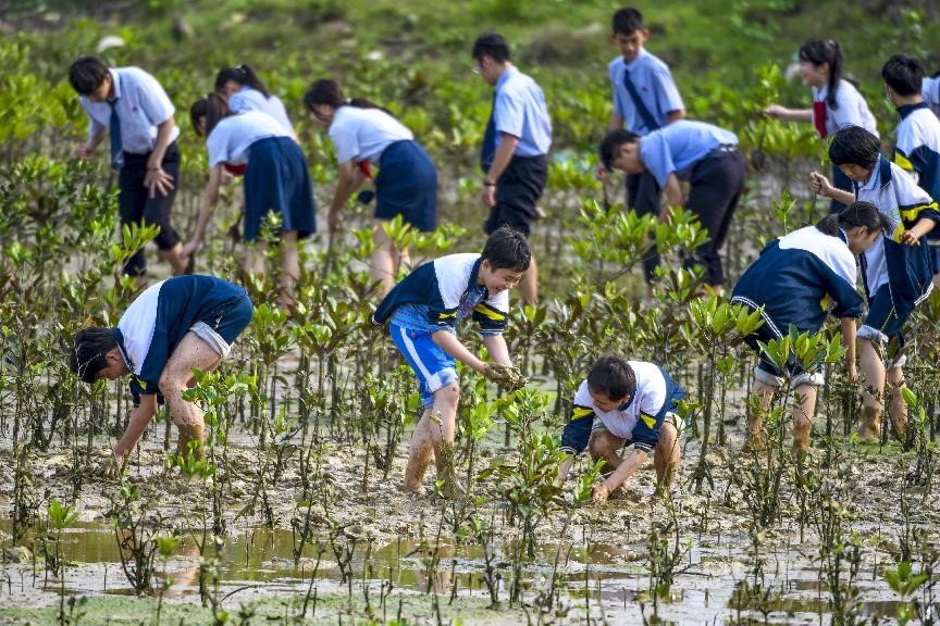 Nearly 100 middle school students and volunteers take part in a wetland protection-themed educational activity at an area of a project launched to return aquaculture ponds to forests in Yanfeng township, Meilan district, Haikou city, capital of south China’s Hainan province, planting trees for the local mangrove wetland, March 11, 2021. (People’s Daily Online/Wang Chenglong)