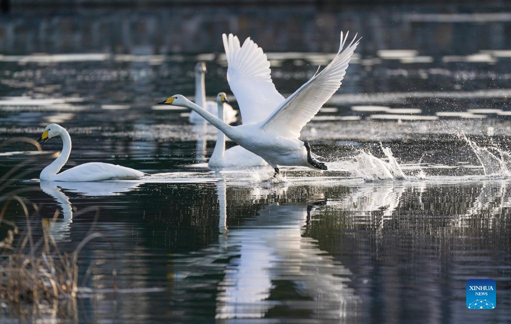 Swans are pictured on the Qingshui river in Miyun District of Beijing, capital of China, Dec. 7, 2021. (Xinhua/Chen Yehua)