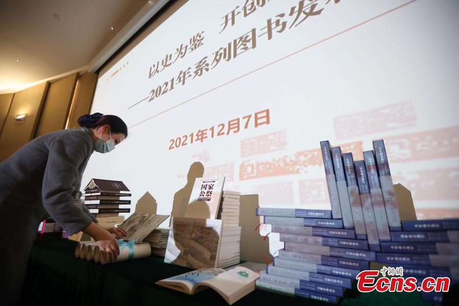 A staff member places books at the publishing event held at the Memorial Hall of the Victims in Nanjing Massacre by Japanese Invaders in Nanjing, East China's Jiangsu Province, Dec. 7, 2021. (Photo: China News Service/Yang Bo)
