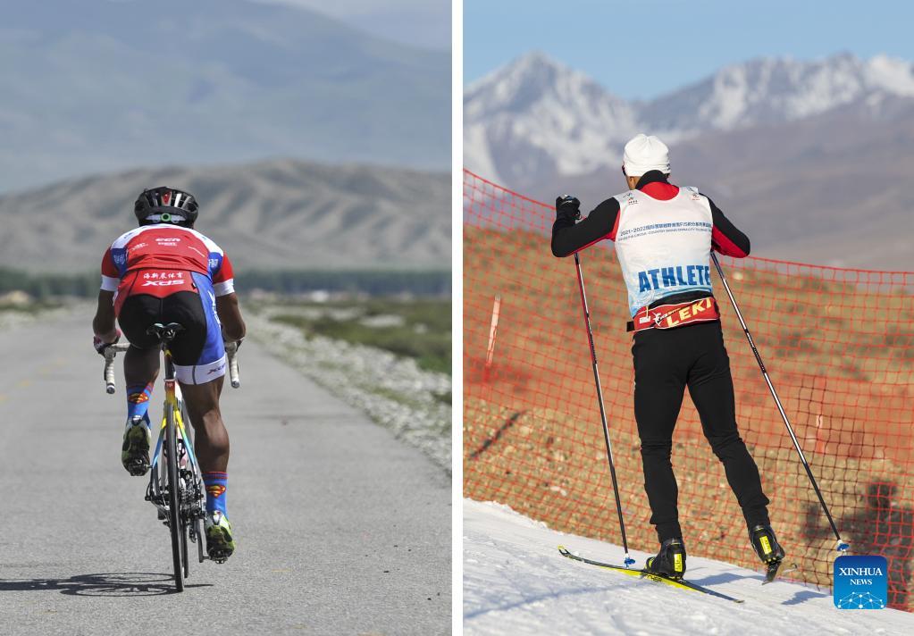 Left: Torsongan Bullik practices cycling in Wenquan County, northwest China's Xinjiang Uygur Autonomous Region, May 29, 2017. Right: Torsongan Bullik practices skiing in Wenquan County, northwest China's Xinjiang Uygur Autonomous Region, Nov. 25, 2021. Torsongan Bullik is a Xinjiang cross-country skiing athlete. He used to be a cyclist and won several champions. Torsongan Bullik shifted from cycling to cross-country skiing on November 20, 2018. He went for cross-country skiing, because there is a chance to attend the Olympics. There is a huge difference between cycling and cross-country skiing, but the Olympic dream led Xinjiang athlete come over all challenges. He is now well prepared and ready to fight for the championship in 2022 Beijing Olympics. (Xinhua/Hu Huhu)