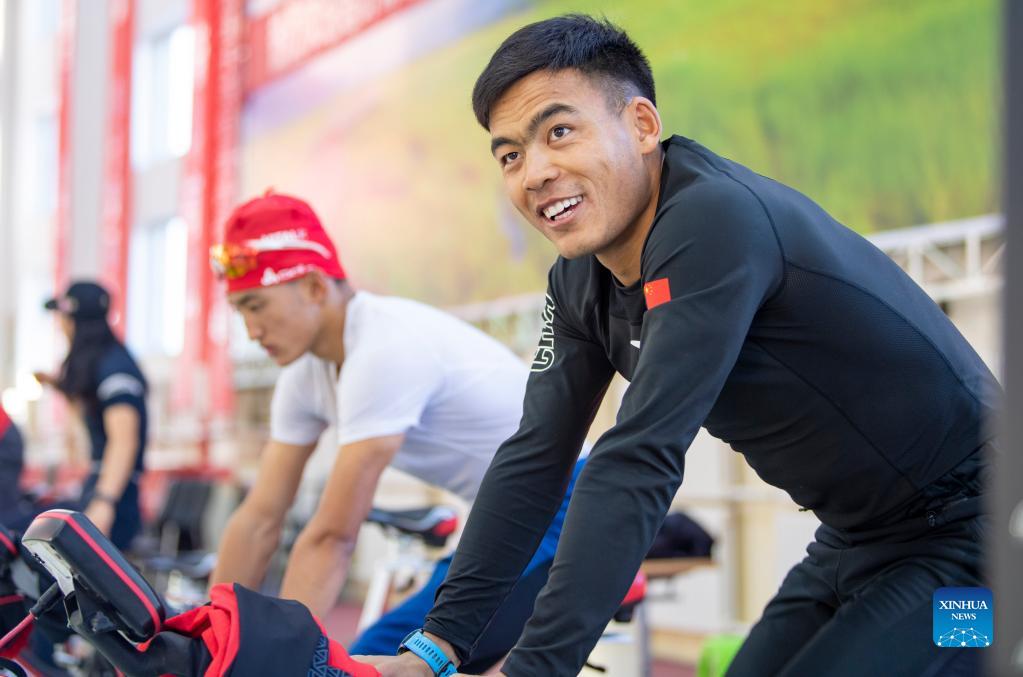 Torsongan Bullik reacts during a trainning in Wenquan County, northwest China's Xinjiang Uygur Autonomous Region, Nov. 24, 2021. Torsongan Bullik is a Xinjiang cross-country skiing athlete. He used to be a cyclist and won several champions. Torsongan Bullik shifted from cycling to cross-country skiing on November 20, 2018. He went for cross-country skiing, because there is a chance to attend the Olympics. There is a huge difference between cycling and cross-country skiing, but the Olympic dream led Xinjiang athlete come over all challenges. He is now well prepared and ready to fight for the championship in 2022 Beijing Olympics. (Xinhua/Hu Huhu)