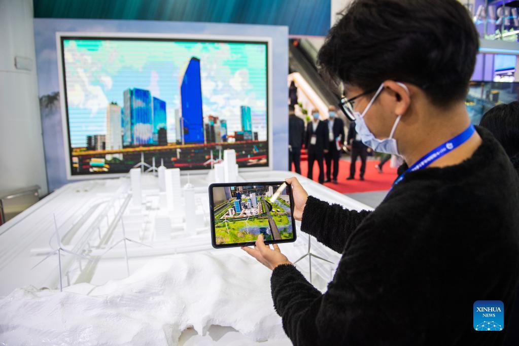 A staff member presents a rail transit product via an AR device at China International Rail Transit and Equipment Manufacturing Industry Exposition in Zhuzhou, central China's Hunan Province, Dec. 8, 2021. The expo kicked off here on Wednesday. (Xinhua/Chen Sihan)