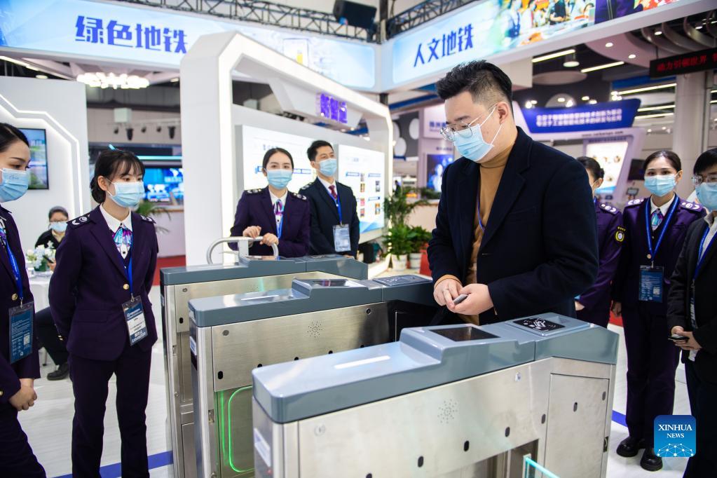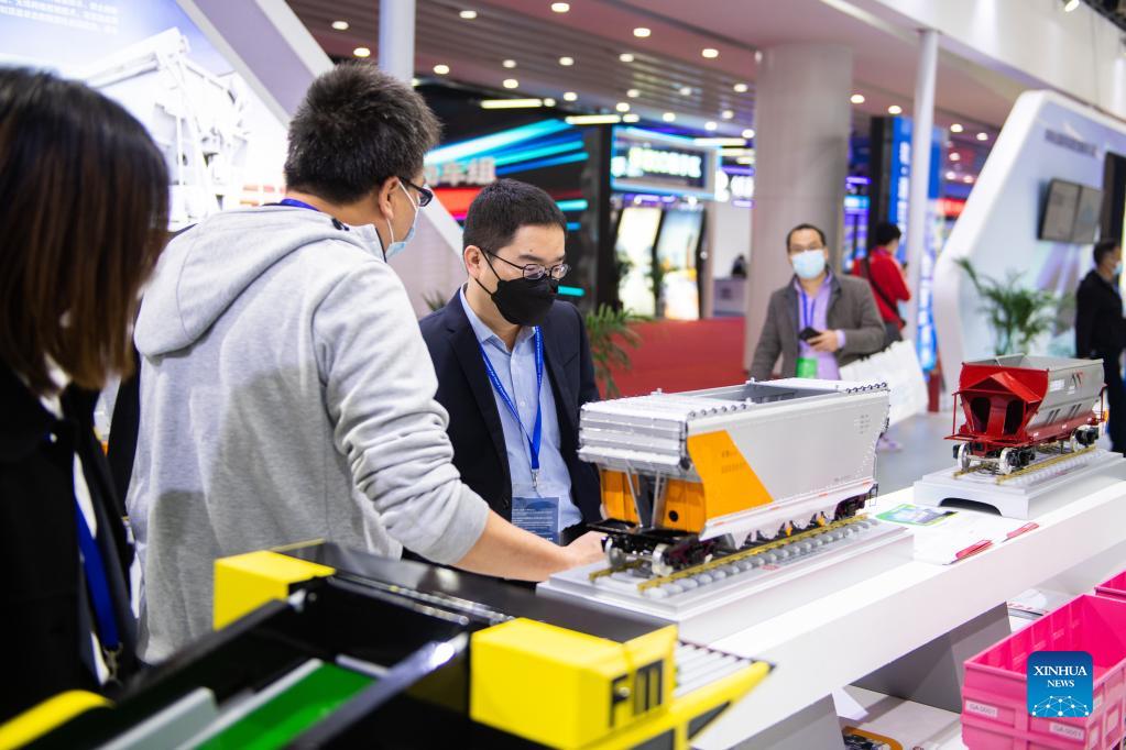 People view the exhibits at China International Rail Transit and Equipment Manufacturing Industry Exposition in Zhuzhou, central China's Hunan Province, Dec. 8, 2021. The expo kicked off here on Wednesday. (Xinhua/Chen Sihan)