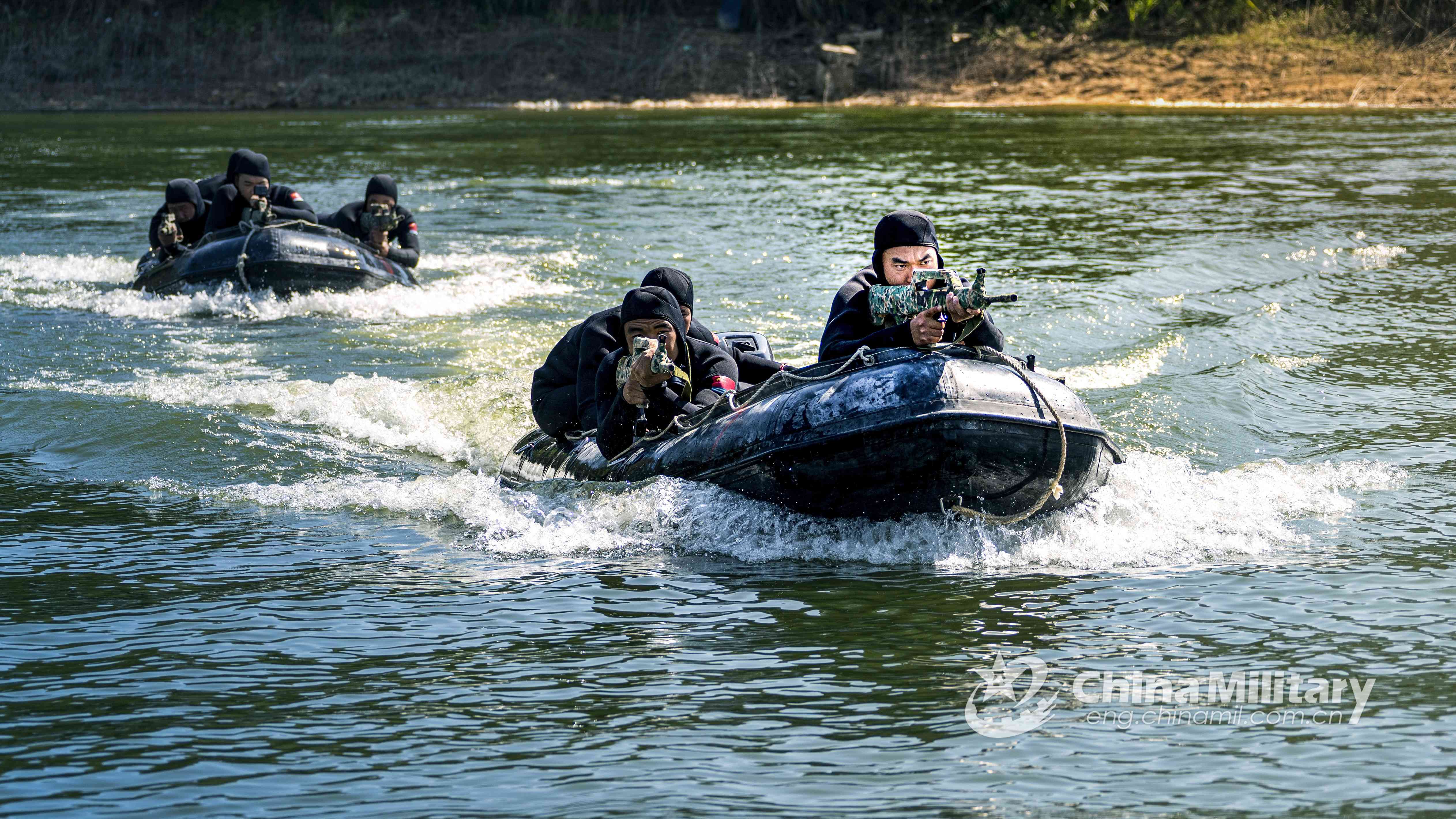 Frogmen assigned to a special operations group under the PLA Navy's Marine Corps manipulate their combat rubber raiding craft (CRRC) to the designated waters during an amphibious assault training exercise on November 18, 2021. (eng.chinamil.com.cn/Photo by Sun Hongtao)