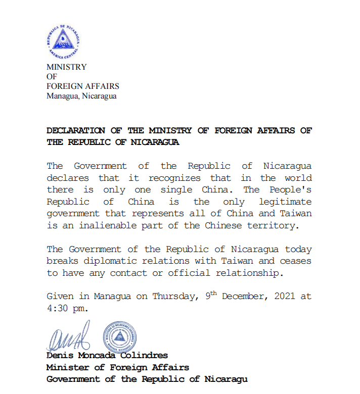 SAN JOSE, Dec. 9 (Xinhua) -- The Foreign Ministry of Nicaragua announced on Thursday that Nicaragua is breaking diplomatic relations with Taiwan.
