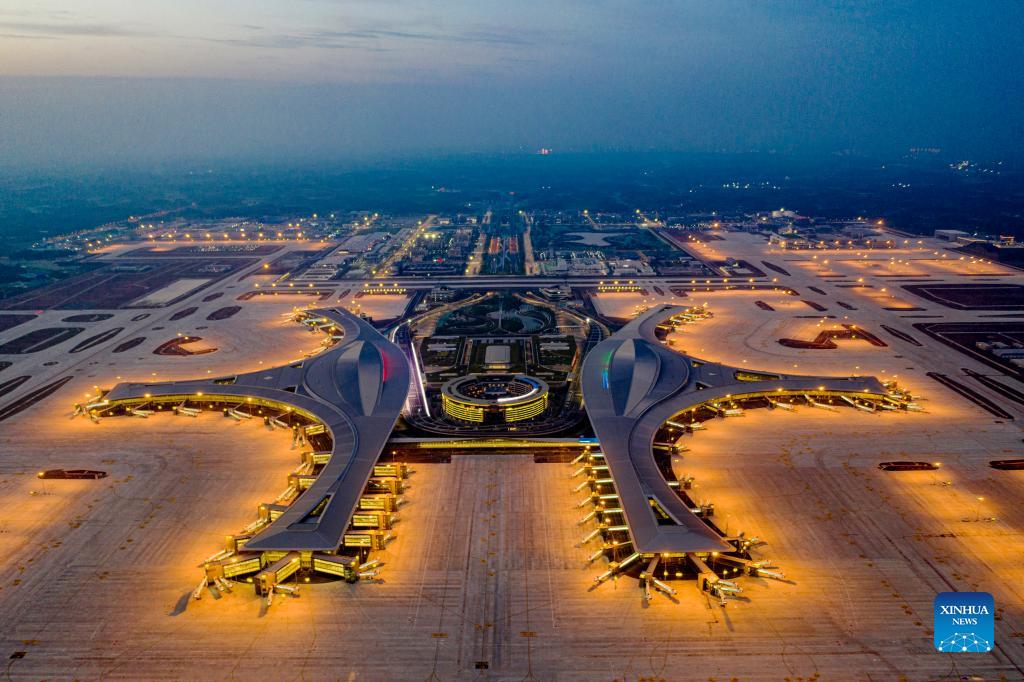 Aerial photo taken on May 7, 2021 shows the Chengdu Tianfu International Airport in southwest China's Sichuan Province. A series of "Super Projects" in Sichuan have been built to promote the development of western China, making contributions to local economic and social development. (Photo by Wang Ruilin/Xinhua)