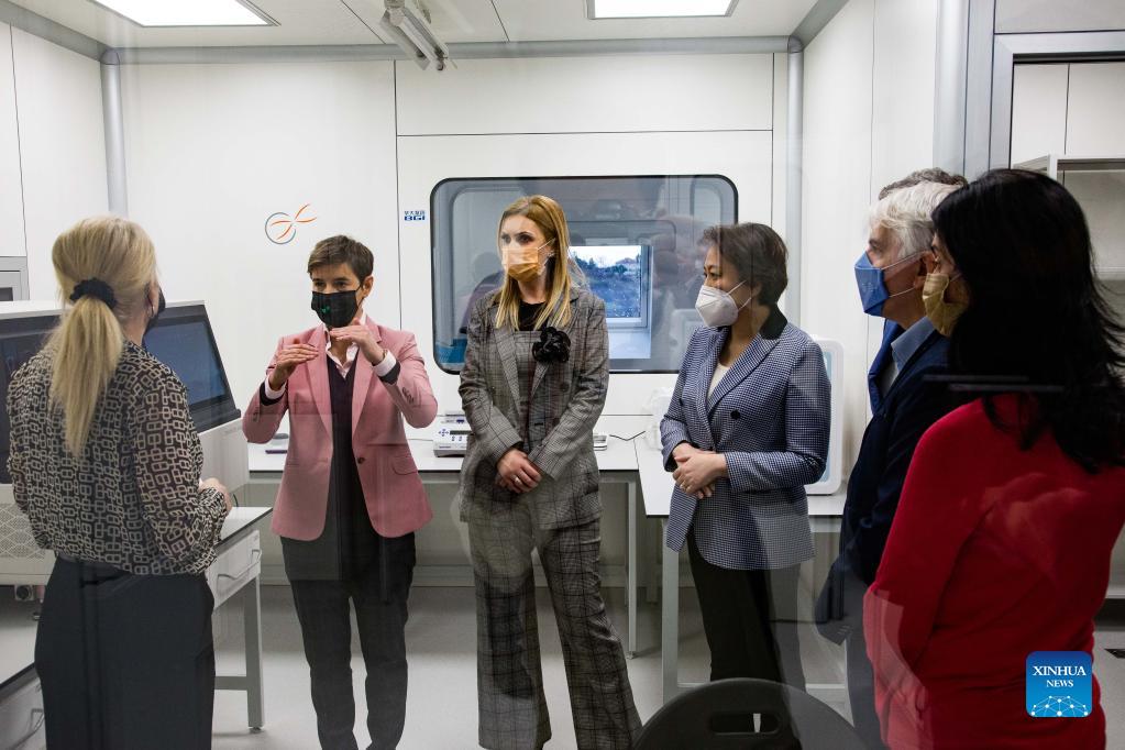 Serbian Prime Minister Ana Brnabic (2nd L) and Chinese Ambassador to Serbia Chen Bo (4th L) visit a center for genome sequencing in Belgrade, Serbia, on Dec. 9, 2021. The center for genome sequencing that will help Serbia fight against coronavirus was opened in Belgrade on Thursday. (Xinhua/Shi Zhongyu)