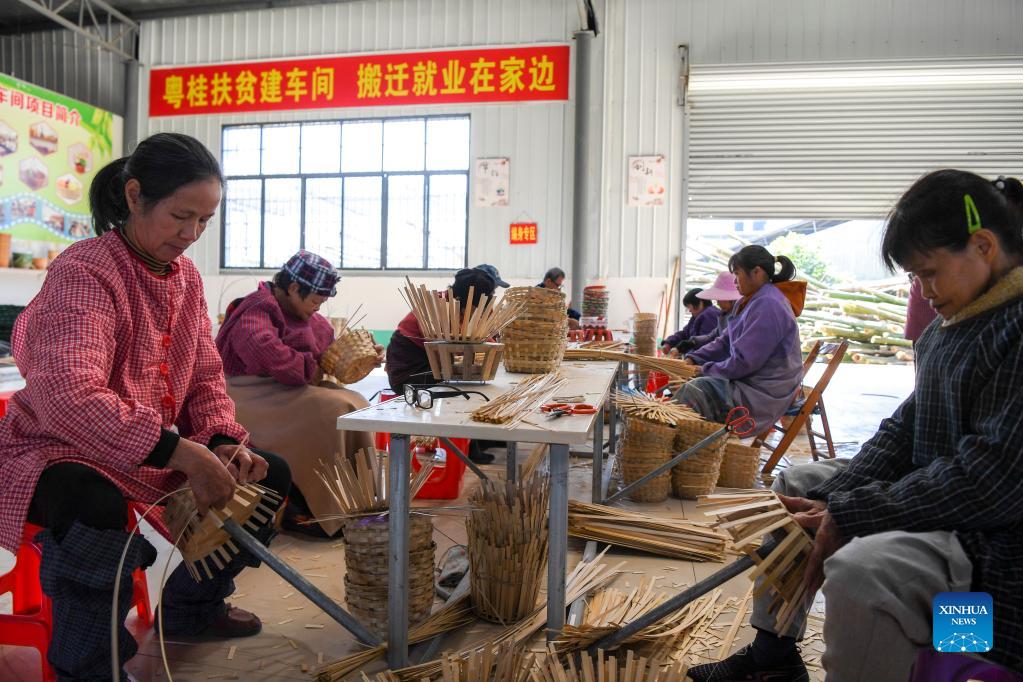 Workers make bamboo baskets at a "pairing assistance" workshop in Xincheng County, south China's Guangxi Zhuang Autonomous Region, Dec. 8, 2021. Xinyi City, Gaozhou City and Huazhou City of south China's Guangdong Province has further deepened the communication this year with Xincheng County of Guangxi under "pairing assistance" program for rural revitalization. The program focuses on the fields such as development of characteristic industries based on local conditions, education, medical and health care and employment. (Xinhua/Cao Yiming)