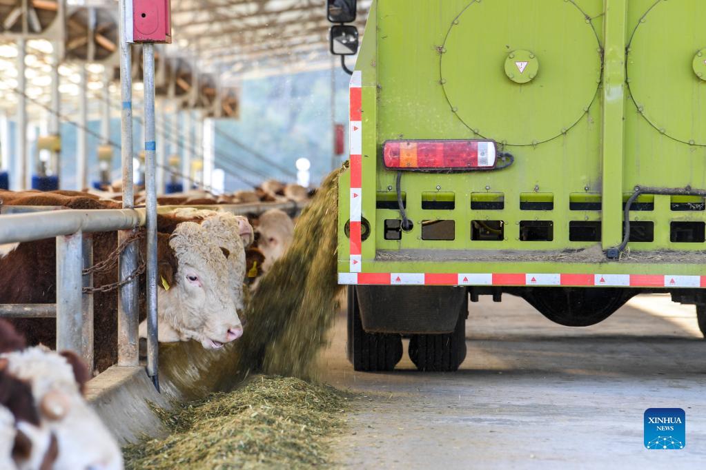 A mobile feeding truck feeds cattle at a cattle breeding base constructed under "pairing assistance" program in Xincheng County, south China's Guangxi Zhuang Autonomous Region, Dec. 8, 2021. Xinyi City, Gaozhou City and Huazhou City of south China's Guangdong Province has further deepened the communication this year with Xincheng County of Guangxi under "pairing assistance" program for rural revitalization. The program focuses on the fields such as development of characteristic industries based on local conditions, education, medical and health care and employment. (Xinhua/Cao Yiming)