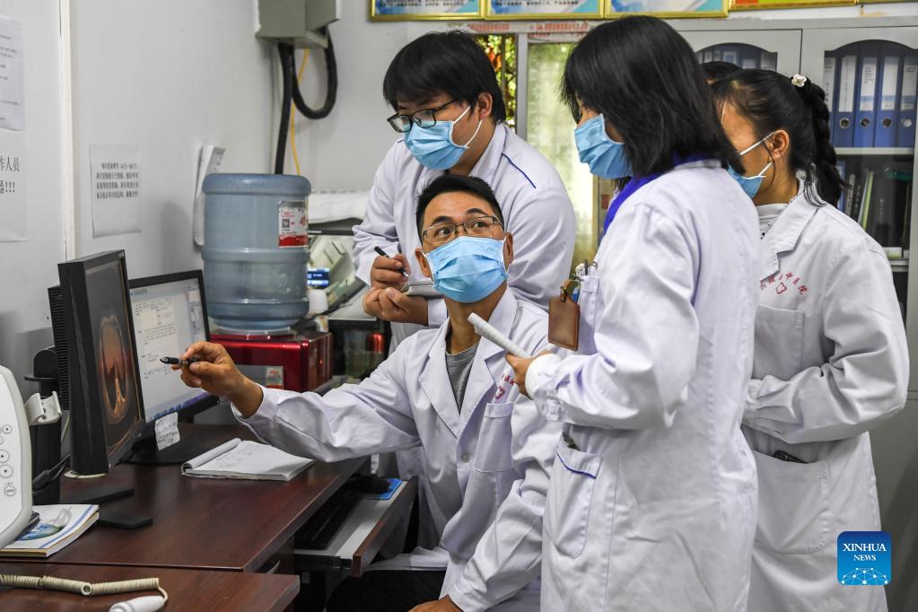 Fan Wei (3rd R), a doctor from south China's Guangdong Province, communicates with local doctors at a hospital of Traditional Chinese Medicine in Xincheng County, south China's Guangxi Zhuang Autonomous Region, Dec. 9, 2021. Xinyi City, Gaozhou City and Huazhou City of south China's Guangdong Province has further deepened the communication this year with Xincheng County of Guangxi under "pairing assistance" program for rural revitalization. The program focuses on the fields such as development of characteristic industries based on local conditions, education, medical and health care and employment. (Xinhua/Cao Yiming)