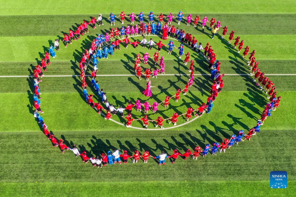 Aerial photo taken on Dec. 8, 2021 shows local students doing exercises organized by teachers from south China's Guangdong Province at a primary school in Xincheng County, south China's Guangxi Zhuang Autonomous Region. Xinyi City, Gaozhou City and Huazhou City of south China's Guangdong Province has further deepened the communication this year with Xincheng County of Guangxi under "pairing assistance" program for rural revitalization. The program focuses on the fields such as development of characteristic industries based on local conditions, education, medical and health care and employment. (Xinhua/Cao Yiming)