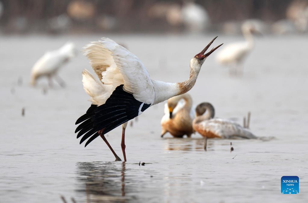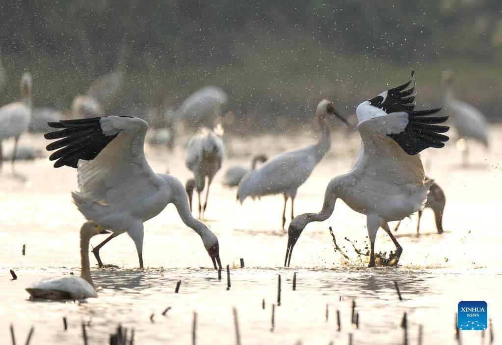 White cranes are seen at the Wuxing white crane conservation area by the Poyang Lake in Nanchang, east China's Jiangxi Province, Dec. 8, 2021. Numerous migratory birds including white cranes and swans have arrived in the wetland by the Poyang Lake, taking it as their winter habitat. (Xinhua/Zhou Mi)