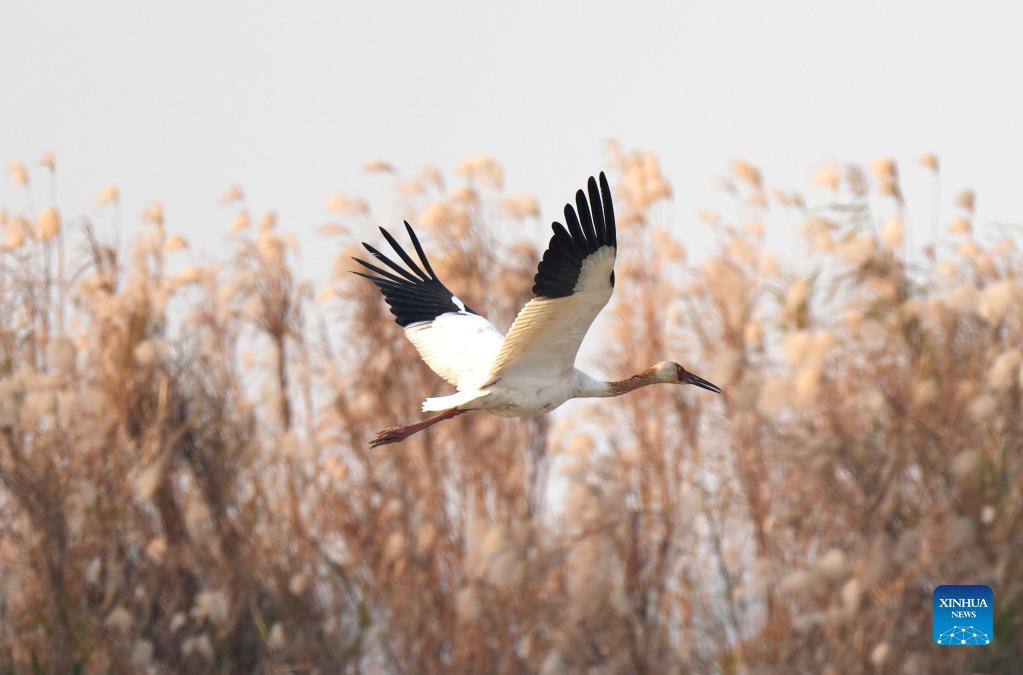 A white crane flies over the Wuxing white crane conservation area by the Poyang Lake in Nanchang, east China's Jiangxi Province, Dec. 8, 2021. Numerous migratory birds including white cranes and swans have arrived in the wetland by the Poyang Lake, taking it as their winter habitat. (Xinhua/Zhou Mi)