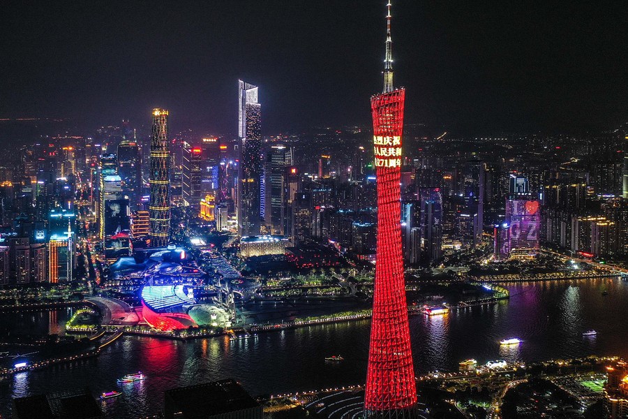 Photo taken on Oct. 3, 2020 shows the night view of Canton Tower in Guangzhou, capital of south China's Guangdong Province. (Xinhua/Liu Dawei)