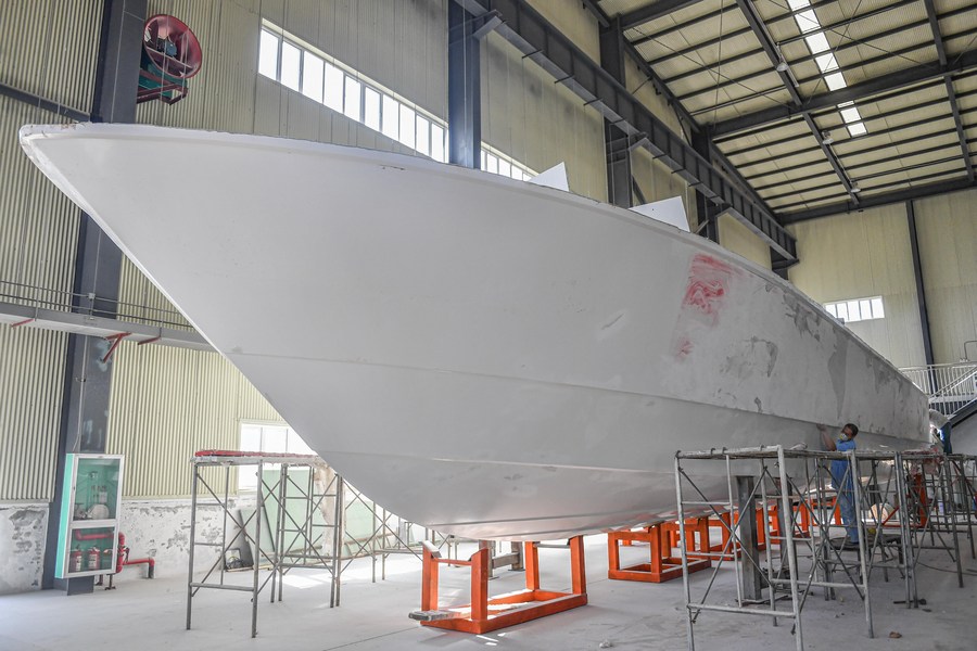 A staff member works at a shipbuilding workshop in the Yangpu Bonded Port Area in Yangpu, south China's Hainan Province, Dec. 3, 2021. (Xinhua/Pu Xiaoxu)