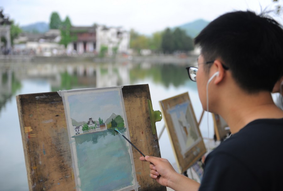 Visitors work on paintings in Xidi scenic spot of Yixian County, east China's Anhui Province, April 24, 2019. (Xinhua/Ren Pengfei)