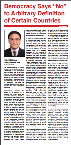 This year marks the 30th anniversary of the end of the Cold War. Instrumentalizing and weaponizing democracy through the Summit for Democracy is a dangerous move to revive the Cold War mentality and has aroused high vigilance from the international community.?The people of the world see very well the flaws and deficiencies of?democracy?in the US,?hypocrisy?in exporting US?“democratic values”, and US?acts of bullying?and hegemony around the world in the name of?democracy.?In fact, problems like money politics, identity politics, wrangling between political parties, political polarization, social division, racial tension and wealth gap in the US have become more acute. All this has weakened the functioning of the US democracy. The world needs to?take a closer look at?the?current state of?democracy?in the US, and the US?itself should also conduct?some soul-searching.
