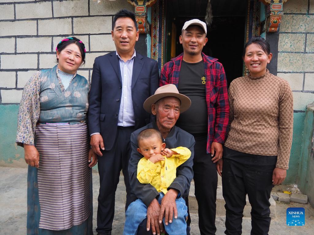 Shodolek poses for a group photo with his family in Gaiba Village, Nedong District of Shannan, southwest China's Tibet Autonomous Region, June 23, 2021. Born in 1946, Shodolek and his whole family were once serfs who had to do heavy works endlessly before the democratic reform in Tibet in 1959. "The serf owner gave us, a family of five, just a little expired tsamba for meals everyday," Shodolek recalled. At that time, serfs were always beaten by serf owners besides suffering starvation and cold. At the age of only 40, mother of Shodolek passed away due to the lack of medical care. After the democratic reform, great changes have taken place in the lives of Shodolek and the villagers. His family was allocated farmland, and Shodolek even later served as the secretary of the Communist Party of China (CPC) branch of his Village. Now, Shodolek has built a two-story building where four generations of his family live together. (Xinhua/Jin Yiqing)