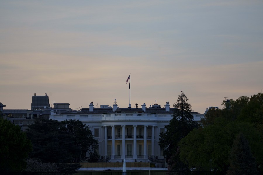 Photo taken on April 13, 2021 shows the White House in Washington, D.C., the United States. (Photo by Ting Shen/Xinhua)