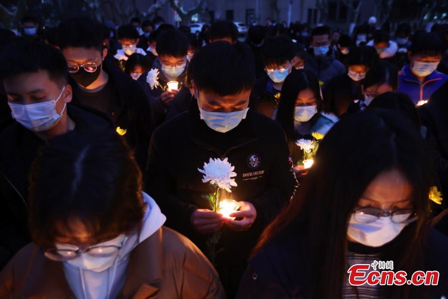 Students of Southeast University light candles for Nanjing Massacre victims on December 12, one day before China's National Memorial Day, in Nanjing, east China's Jiangsu Province.(China News Service/Yang Bo)