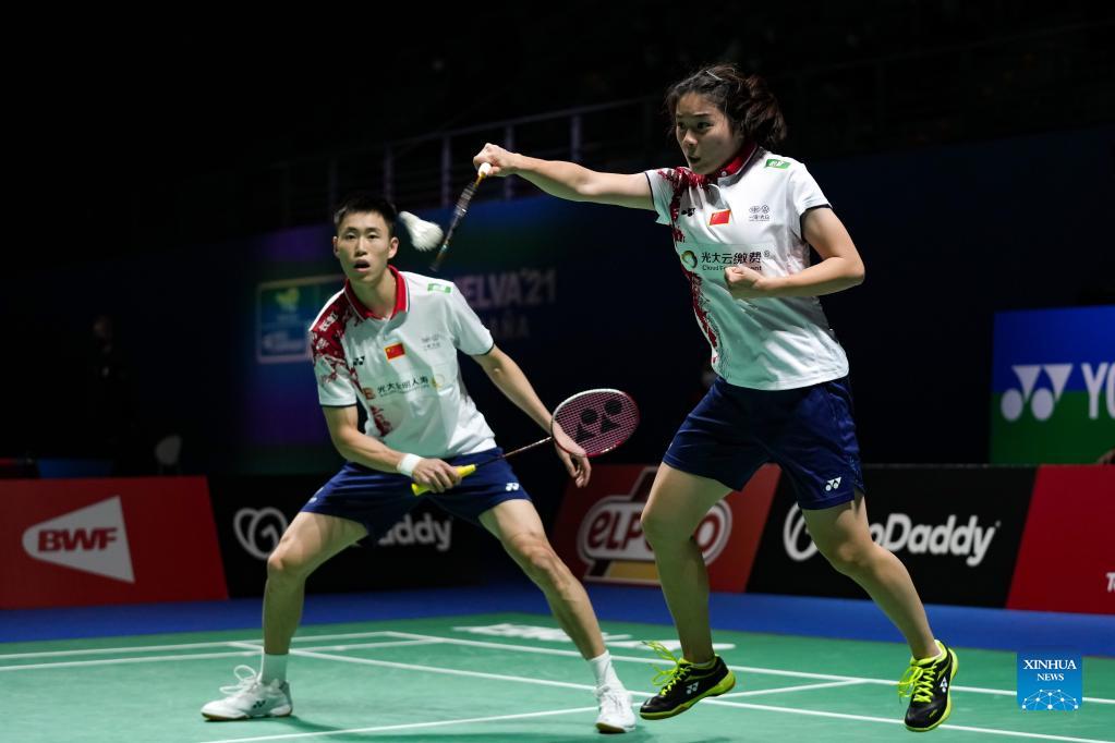 Ou Xuanyi/Feng Xueying (R) of China compete in the mixed doubles first round match against Niclas Nohr/Amalie Magelund of Denmark at the BWF World Championships 2021 in Huelva, Spain, Dec. 12, 2021. (Xinhua/Zhang Cheng)