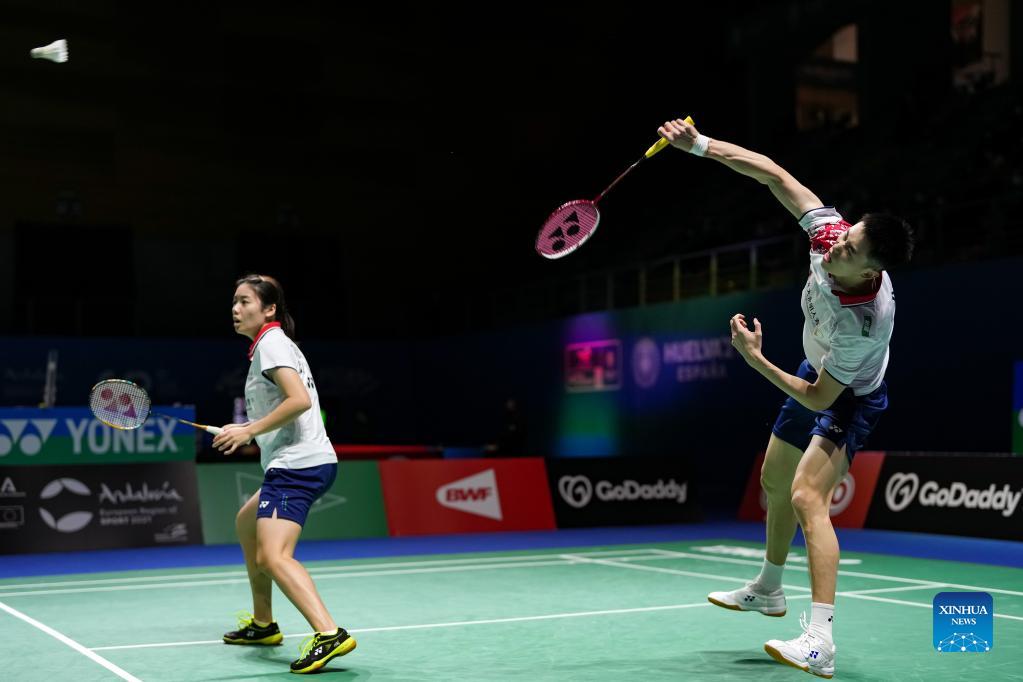 Ou Xuanyi (R)/Feng Xueying of China compete in the mixed doubles first round match against Niclas Nohr/Amalie Magelund of Denmark at the BWF World Championships 2021 in Huelva, Spain, Dec. 12, 2021. (Xinhua/Zhang Cheng)