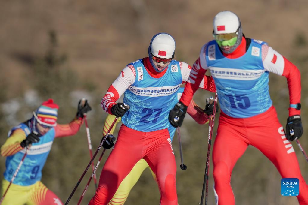 Athletes of Chinese national cross-country skiing team compete during an intra-team simulation competition preparing for the Beijing 2022 Olympic Winter Games in Zhangjiakou City, north China's Hebei Province, on Dec. 12, 2021. (Xinhua/Hu Huhu)