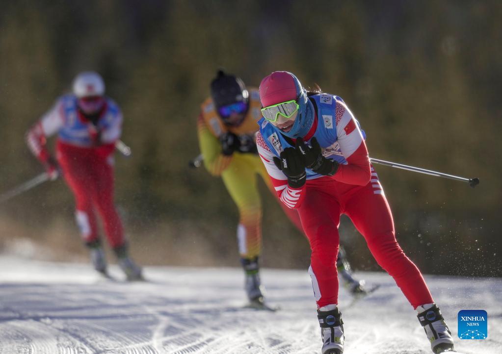 Athletes of Chinese national cross-country skiing team compete during an intra-team simulation competition preparing for the Beijing 2022 Olympic Winter Games in Zhangjiakou City, north China's Hebei Province, on Dec. 12, 2021. (Xinhua/Hu Huhu)