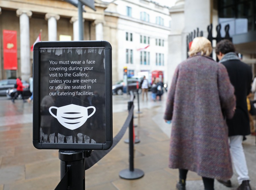 People walk past a COVID-19 notice board at the entrance of the National Gallery in London, Britain, Dec. 12, 2021. (Xinhua/Li Ying)