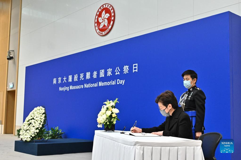 Carrie Lam, chief executive of the Hong Kong Special Administrative Region, attends a memorial ceremony to mourn the victims of the Nanjing Massacre on the occasion of the eighth National Memorial Day in Hong Kong, south China, Dec. 13, 2021. The Nanjing Massacre took place after the Japanese troops captured the city on Dec. 13, 1937. Over six weeks, they killed about 300,000 Chinese civilians and unarmed soldiers in one of the most barbaric episodes of World War II. (Xinhua)