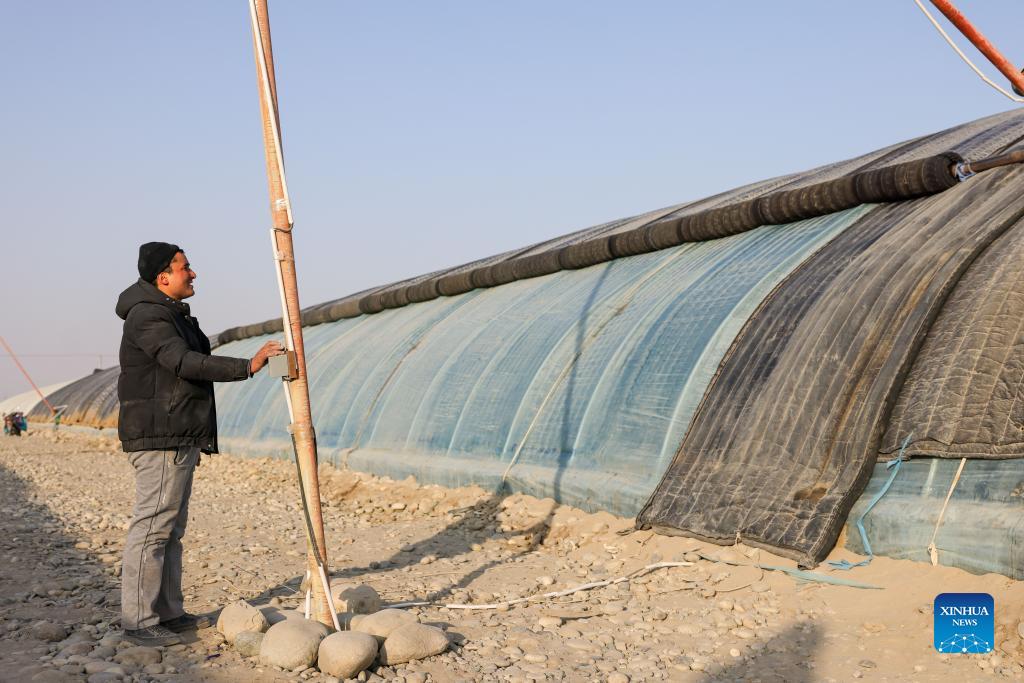 A villager works at a greenhouse in an industrial park in Shache County of Kashgar, northwest China's Xinjiang Uygur Autonomous Region, Dec. 12, 2021. Located in the southwestern edge of the Taklimakan Desert, Shache County has suffered from many obstacles brought by the vast desert to the economic development. In 2021, Shache County constructed an agricultural industrial park by taking advantage of the sunlight resources of the vast barren land. Greenhouses, sheep breeding bases and poultry breeding bases have been built in the industrial park, helping about 3,000 villagers find jobs nearby their homes and increase their incomes. (Xinhua/Ding Lei)