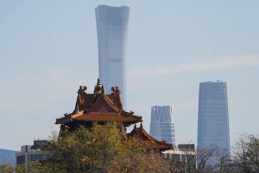 Photo taken on Nov. 23, 2020 shows a turret of the Palace Museum (front) and buildings in CBD area (rear) of Beijing, capital of China. (Xinhua/Ju Huanzong)