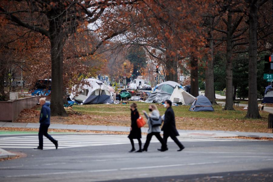 People pass by tents of the homeless in Washington, D.C., the United States, Dec. 8, 2021. (Photo by Ting Shen/Xinhua)