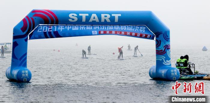 Competitors steer their stand-up paddle (SUP) boards at an intense race on the Donghu Lake in Wuhan, central China's Hubei Province, Dec 13, 2021. (China News Service/Zhang Chang)