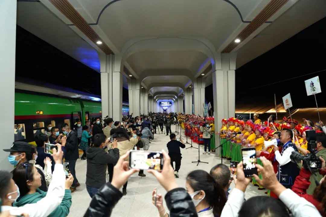 The completion and opening of the China-Laos Railway has made the train dream of more than 2.4 million people of all ethnic groups in Pu’er for many years come true. At 19:35, the bullet train arrived at Pu’er Station, and the masses of all ethnic groups in Pu’er sang and danced to celebrate this moment.