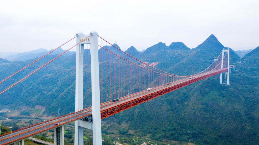 With a height of 332 meters, the main tower of Pingtang Bridge is the world's tallest reinforced concrete bridge tower. Travel time between the counties of Pingtang and Luodian has been reduced from over two and a half hours to about one hour since the Pingtang Bridge opened to traffic in December 2019.