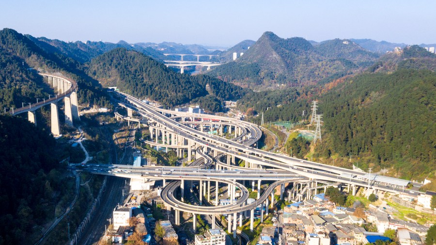 Aerial photo taken on Nov. 30, 2021 shows the Qianchun interchange in Guiyang, southwest China's Guizhou Province. (Xinhua/Ou Dongqu)