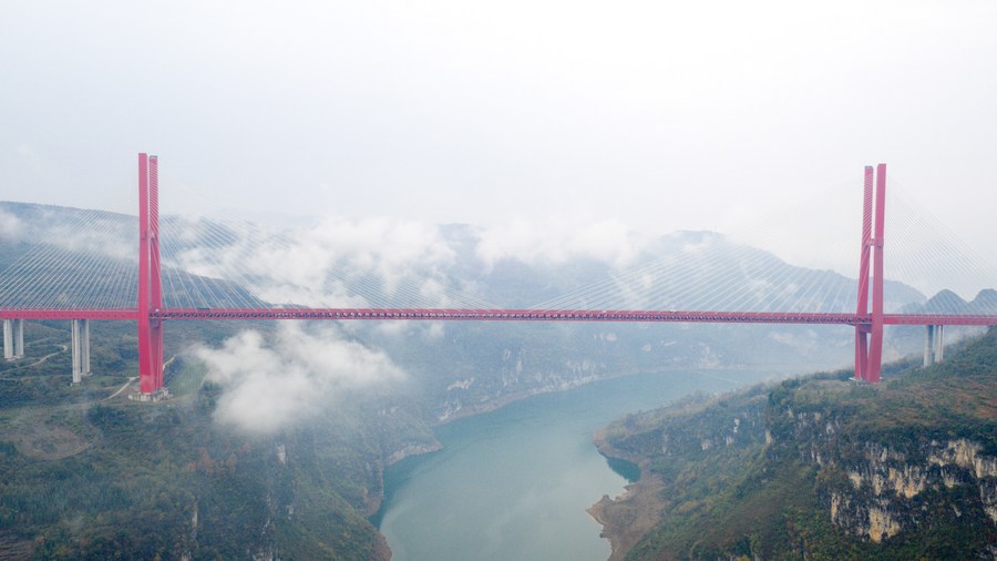 Aerial photo taken on Nov. 26, 2021 shows the Yachihe Bridge in southwest China's Guizhou Province. (Xinhua/Ou Dongqu)