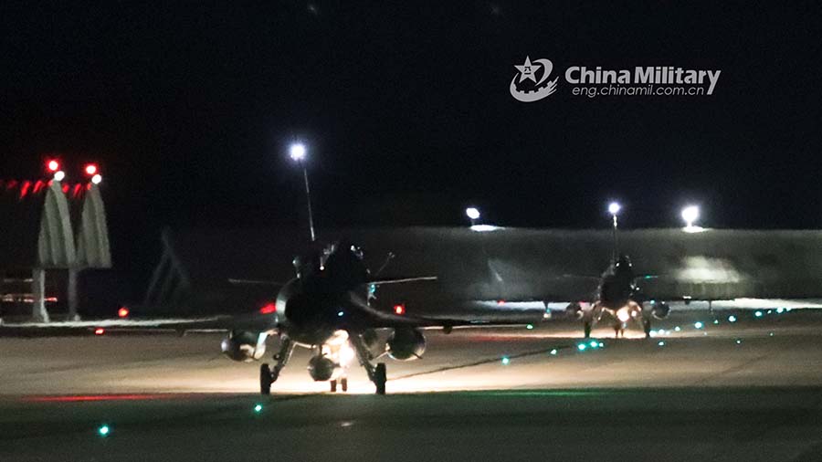 J-10 fighter jets attached to an aviation brigade of the air force under the PLA Southern Theater Command taxi down the flightline in formation during a trans-regional flight mission aiming to test the troop’s long-range combat capability in late November, 2021. (eng.chinamil.com.cn/Photo by Huang Rongkai)