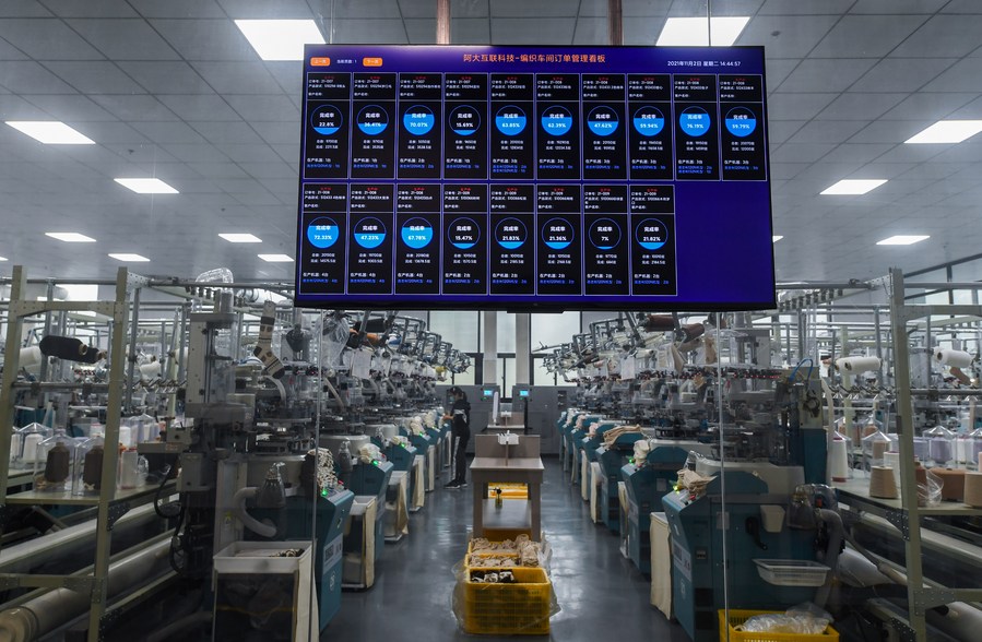 Photo taken on Nov. 2, 2021 shows a sock factory equipped with intelligent devices and digitalized system in Zhuji, east China's Zhejiang Province. (Xinhua/Xu Yu)