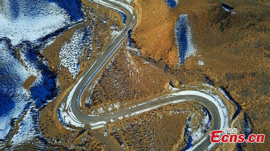 Aerial photo taken on December 13, 2021 shows a winding rural road in Hejing County of Bayingolin Mongolian Autonomous Prefecture, northwest China's Xinjiang Uyghur Autonomous Region. (Photo: China News Service)