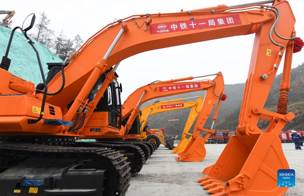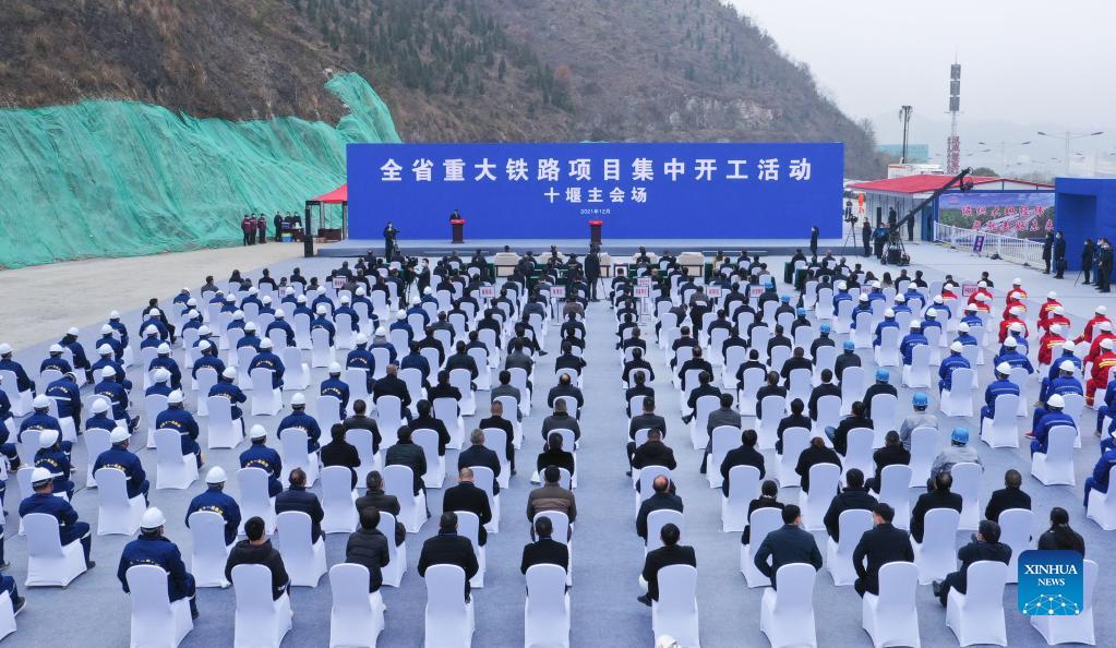 The commencement ceremony of the Xi'an-Shiyan high-speed railway is held in Shiyan, central China's Hubei Province, Dec. 15, 2021. Construction of the Xi'an-Shiyan high-speed railway, linking Xi'an City in northwest China's Shaanxi Province and Shiyan City in central China's Hubei Province, kicked off on Wednesday. The 255.76-km-long railway, with a designed speed of 350 kilometers per hour, is expected to be completed and put into operation in 2026. (Xinhua/Cheng Min)