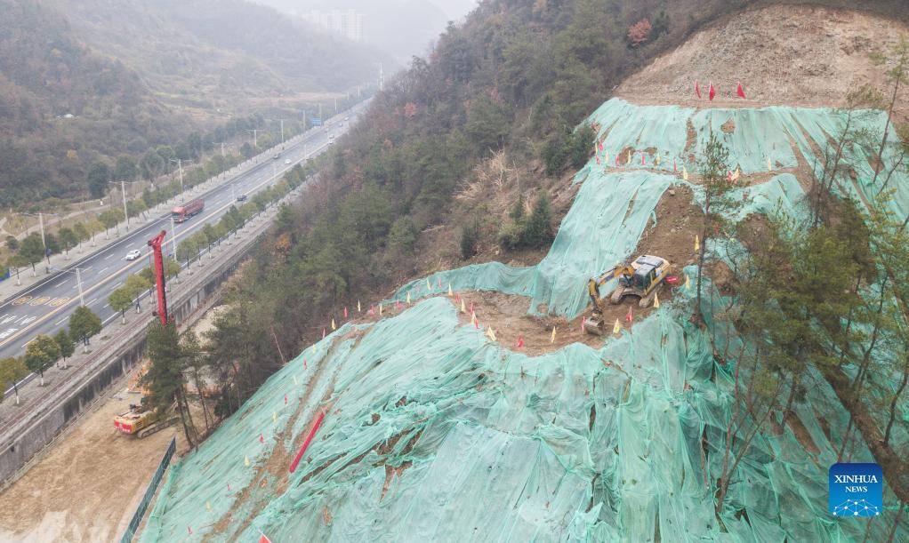 Photo taken on Dec. 15, 2021 shows the construction site of the Xi'an-Shiyan high-speed railway in Shiyan, central China's Hubei Province. Construction of the Xi'an-Shiyan high-speed railway, linking Xi'an City in northwest China's Shaanxi Province and Shiyan City in central China's Hubei Province, kicked off on Wednesday. The 255.76-km-long railway, with a designed speed of 350 kilometers per hour, is expected to be completed and put into operation in 2026. (Xinhua/Cheng Min)