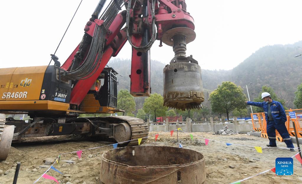 A worker operates a machine at the construction site of the Xi'an-Shiyan high-speed railway in Shiyan, central China's Hubei Province, Dec. 15, 2021. Construction of the Xi'an-Shiyan high-speed railway, linking Xi'an City in northwest China's Shaanxi Province and Shiyan City in central China's Hubei Province, kicked off on Wednesday. The 255.76-km-long railway, with a designed speed of 350 kilometers per hour, is expected to be completed and put into operation in 2026. (Xinhua/Cheng Min)